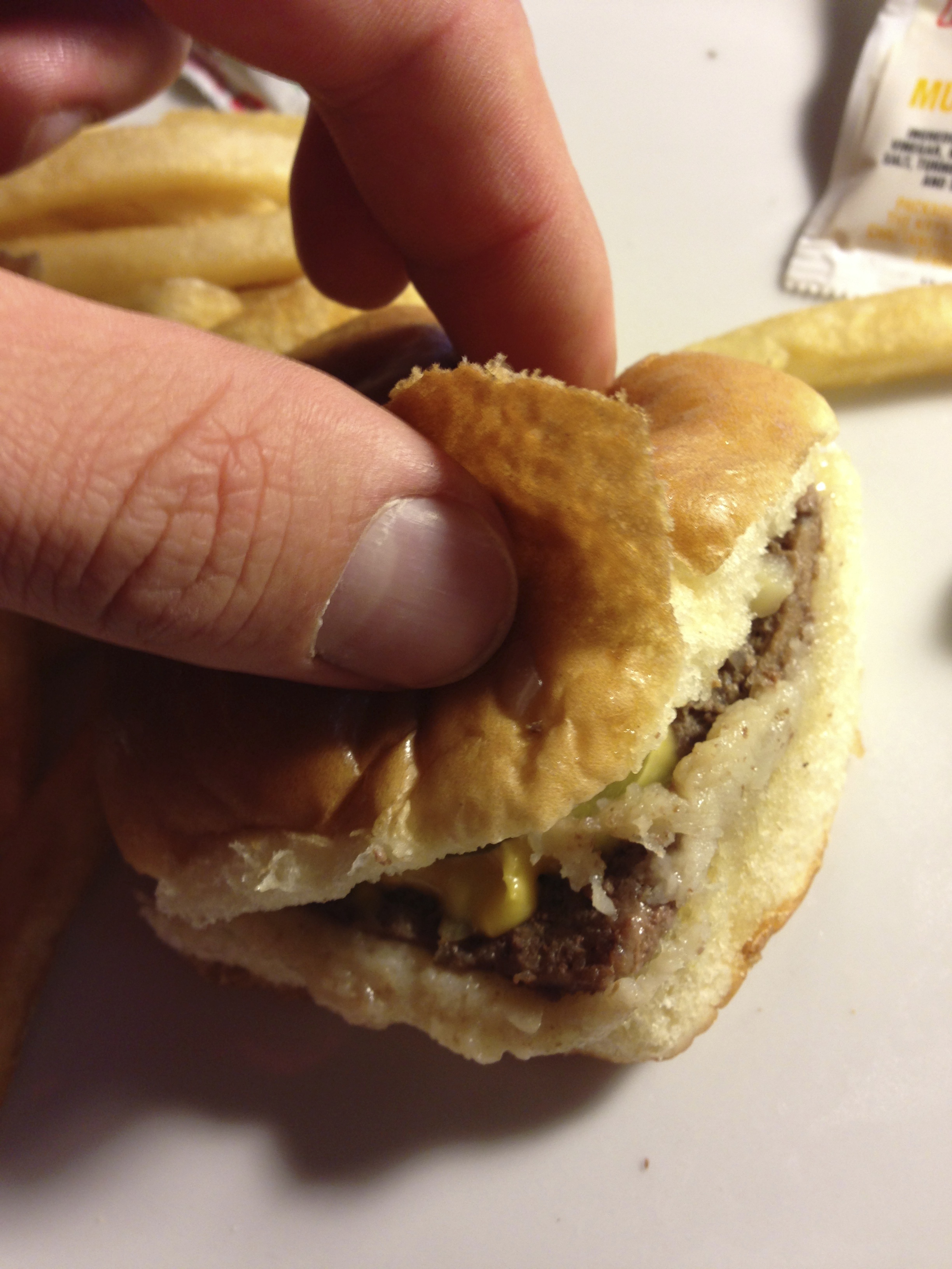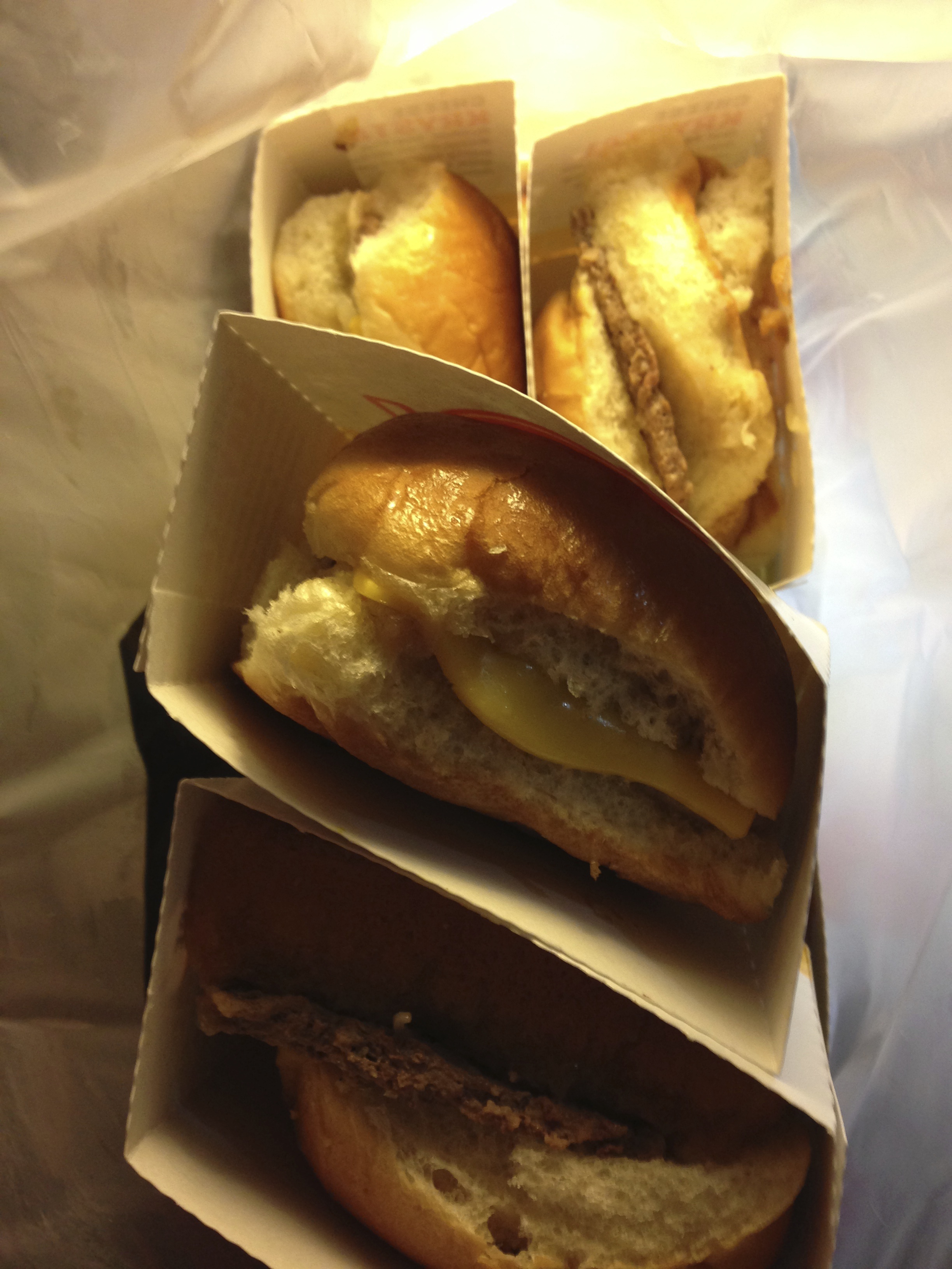Bei Krystal hab ich mich nicht lumpen lassen, und direkt mal 10 Stück für $5.99 mitgenommen. Dazu noch zwei mittelgroße Portionen Pommes Frittes. Und ne handvoll Mayonnaise-, Senf- und Ketchup-Tüten. Das sieht dann ungefähr so aus: