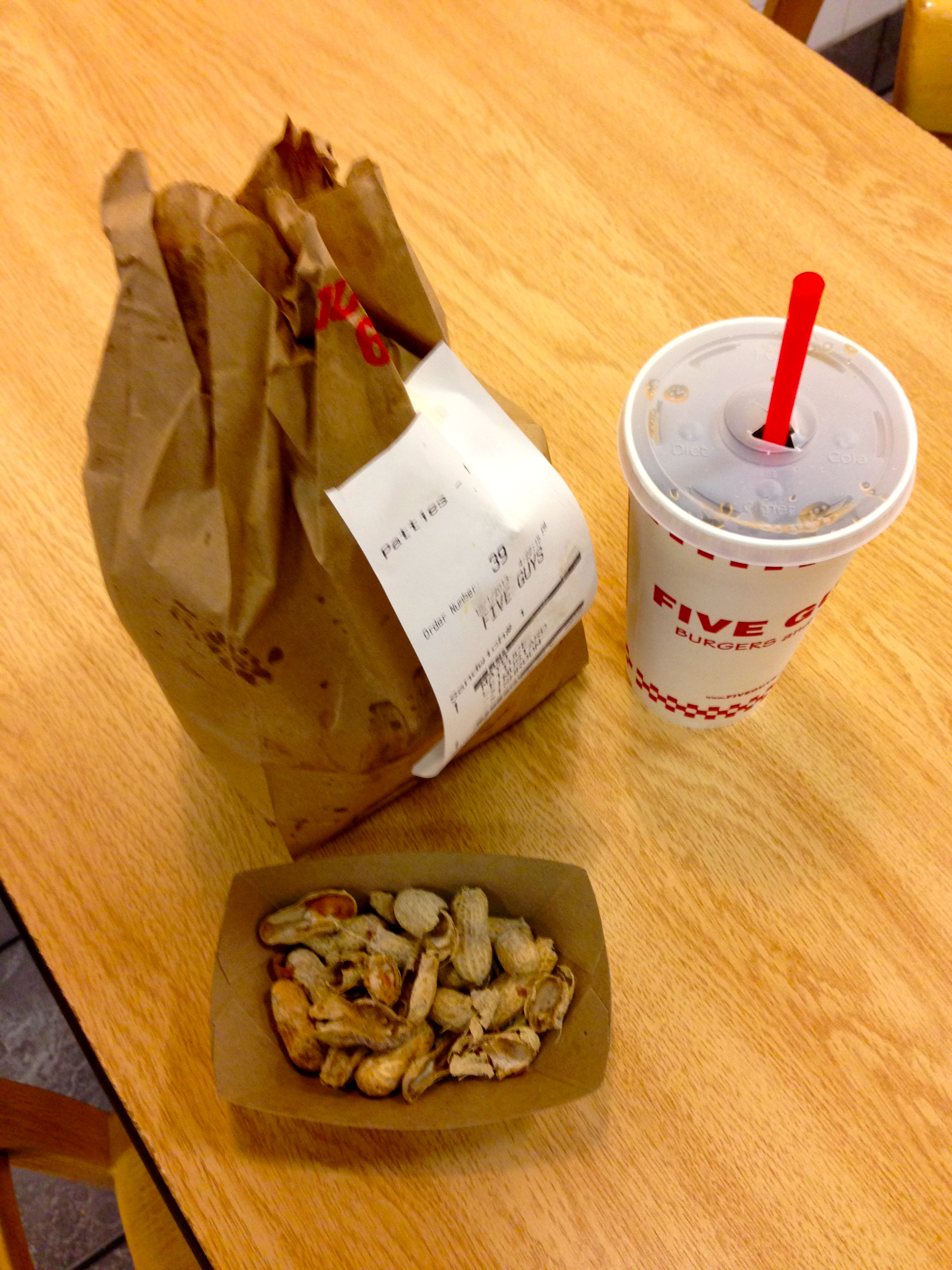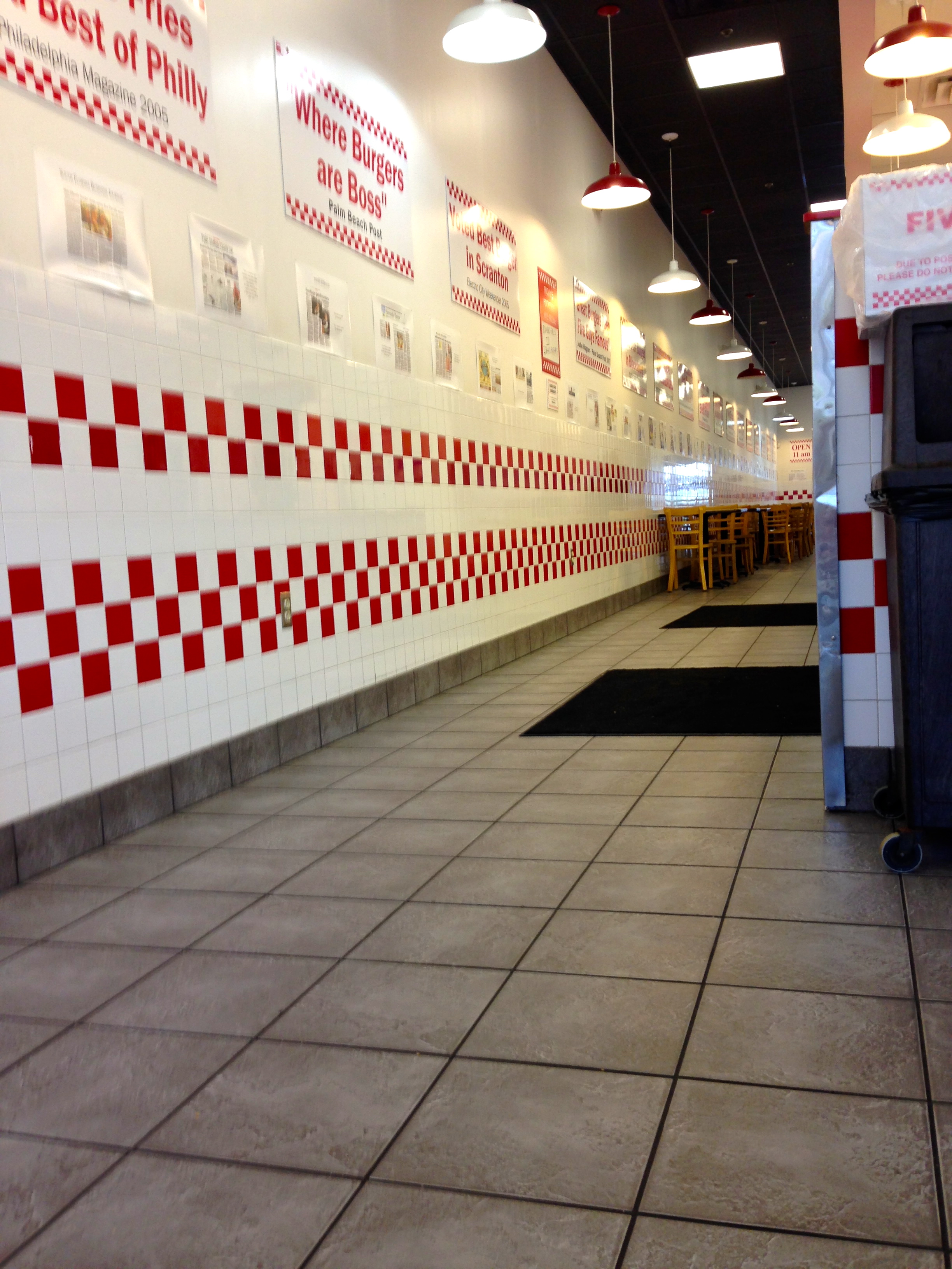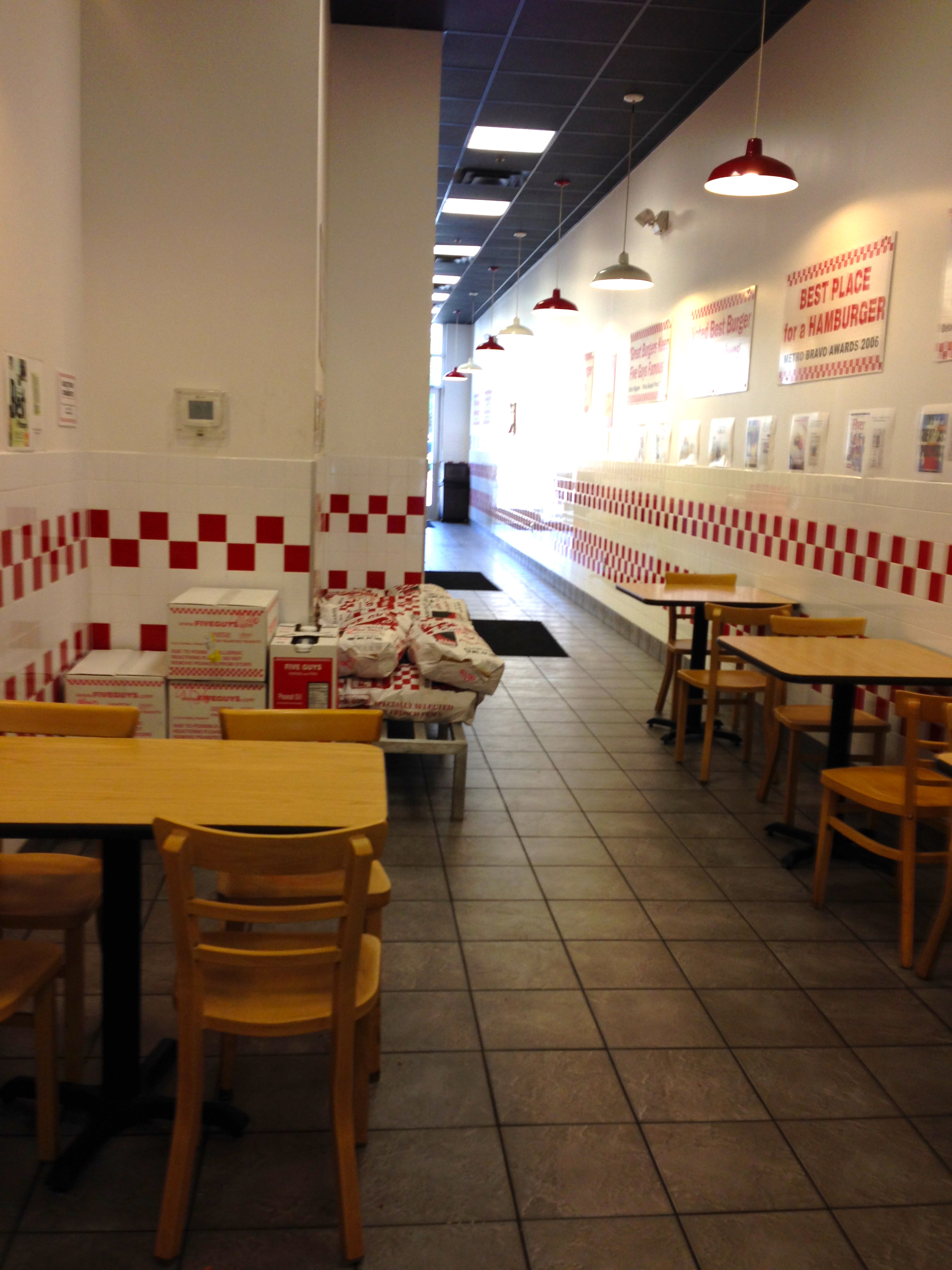 Die Einrichtung ist schlicht, aber solide. Der Laden ist immer sauber, und die Angestellten sind super freundlich. Die Wände sind zugepflastert mit positiven bis überschwänglichen Rezensionen aus Zeitungen und Zeitschriften von überall in den USA. Ursprünglich kommt Five Guys aus der Washington, D.C.-Kante, mittlerweile gibt es aber Filialen in 48 Staaten und in Kanada. Die Five Guys Restaurants sind zwar eine Kette, werden hierzulande aber nicht in die Kategorie Fast Food eingeordnet, sondern als Fast Casual Restaurant bezeichnet. Dementsprechend bezahlt man hier auch etwas mehr als bei den “echten” Fast Food Restaurants. Burger rangieren zwischen $3.84 und $6.99, die Fritten gibts ab $2.29, und ein kleines Getränk kostet $1.99.