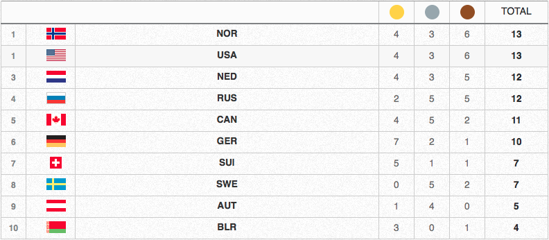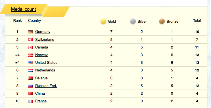 Dann ist mir beim Besuch irgendeiner amerikanischen Webseite aufgefallen, dass der Medaillenspiegel dort ganz anders aussieht. Da waren die USA ganz vorne. Und Norwegen. Merkwürdig, dachte ich, aber die Erklärung dafür ist einfach. Damit die USA weiter oben stehen, zählen nicht die Goldmedaillen, die das Team einer Nation gewonnen hat, sondern die Summe der Gold-, Silber- und Bronzemedaillen. Wie z.B. auf usatoday.com: